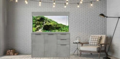 The concrete effect finish of the cabinet and the hood surround is the latest in contemporary furniture design matching the current styles available in furniture stores perfectly. The aquarium offers plenty of water volume for your fish and allows the creation of fantastic aquascapes.