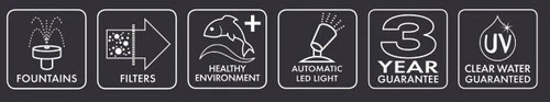 Inpond 5 in 1 pump is a complete ‘life support system’ with decorative fountain features. It includes a pump, filter, 5w UVC and automatic night time LED. Clear water guaranteed