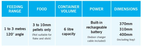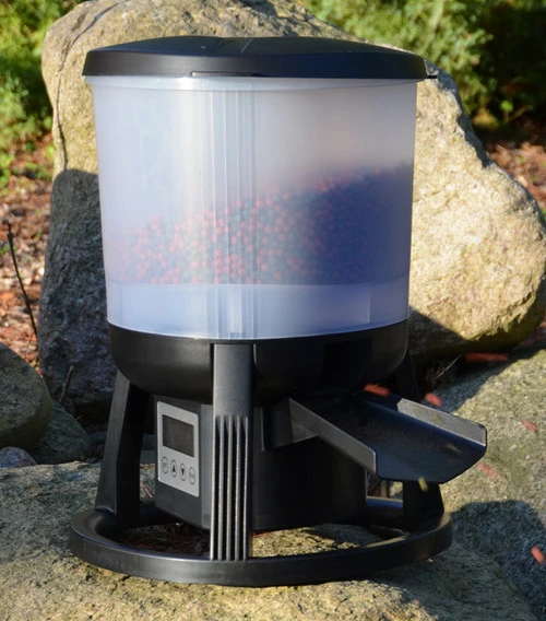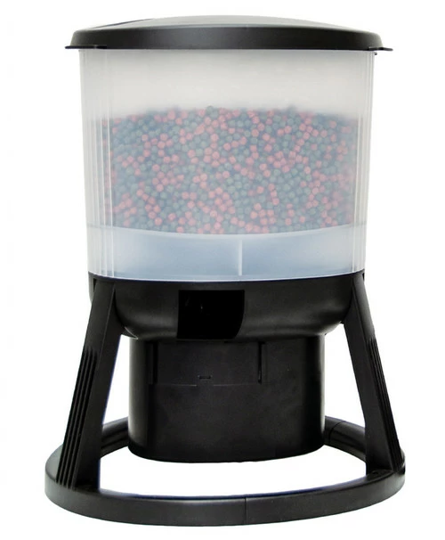 evoFeed Automatic is an automatic fish feeder suitable for medium and large ponds. The unit can be programmed to dispense food into the pond at timed intervals throughout the day. The distance the food is propelled, and the amount of time it is dispensed for, are also adjustable. It is ideal for Koi ponds where large quantities of pellets are fed frequently, throughout the day. It is also ideal for holiday feeding.