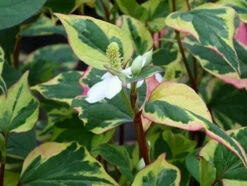 Houttuynia cordata ‘Chameleon’ – This very popular, brightly coloured plant has red, yellow and green scented leaves. The dense yellow flower spikes have 4 white bracts at the base, making them look like single white flowers.